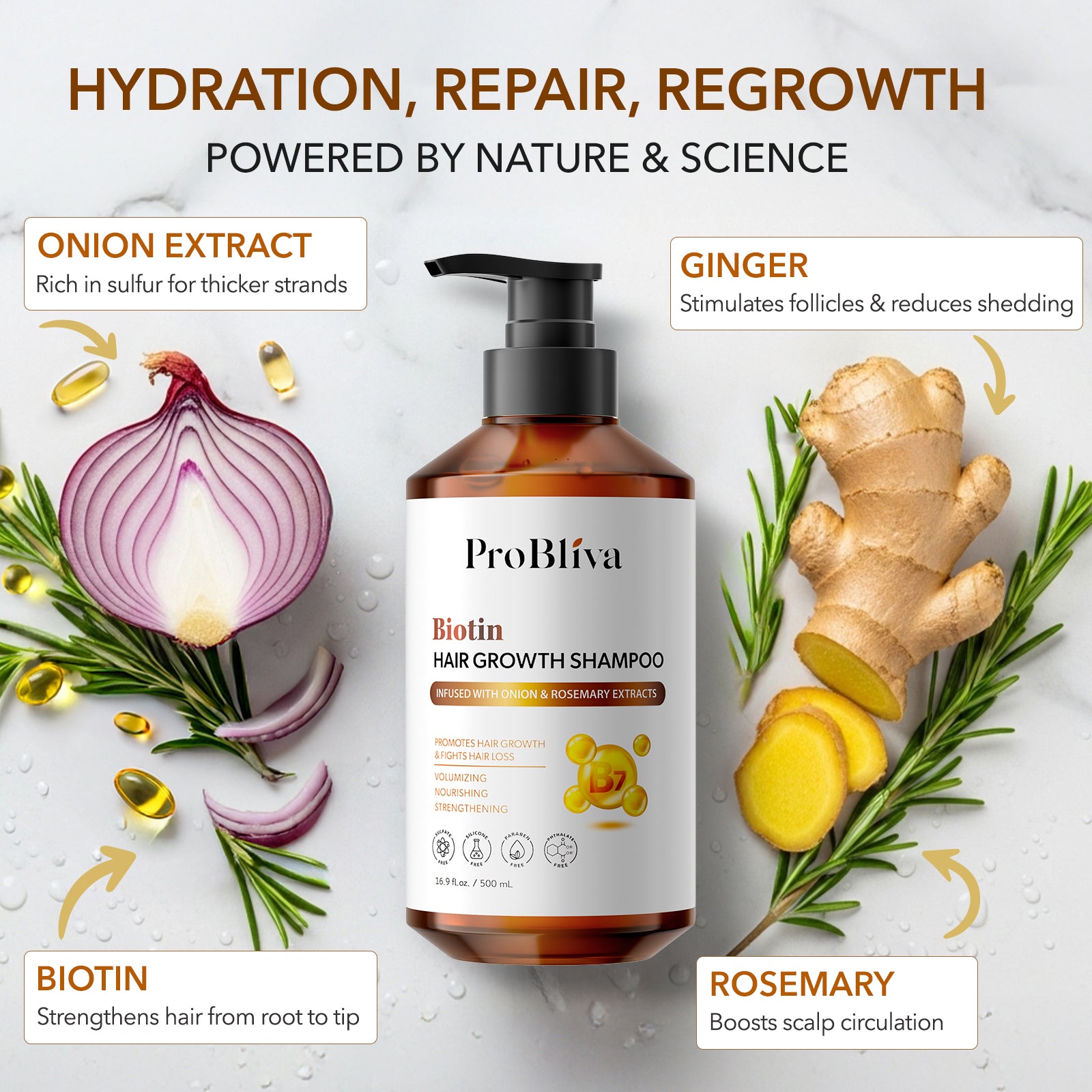 - CLEAN, BOTANICAL & SAFE FORMULAS: Sulfate-free, paraben-free, silicone-free, and made with botanical ingredients. For best results, use the ProBliva Onion Hair Conditioner.